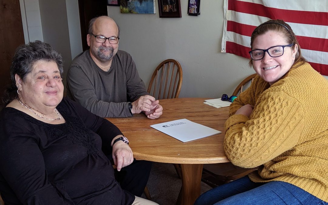 Three people at table smiling