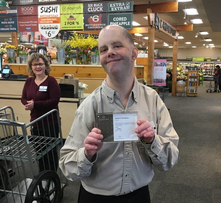 Male employee holding certificate at grocery store