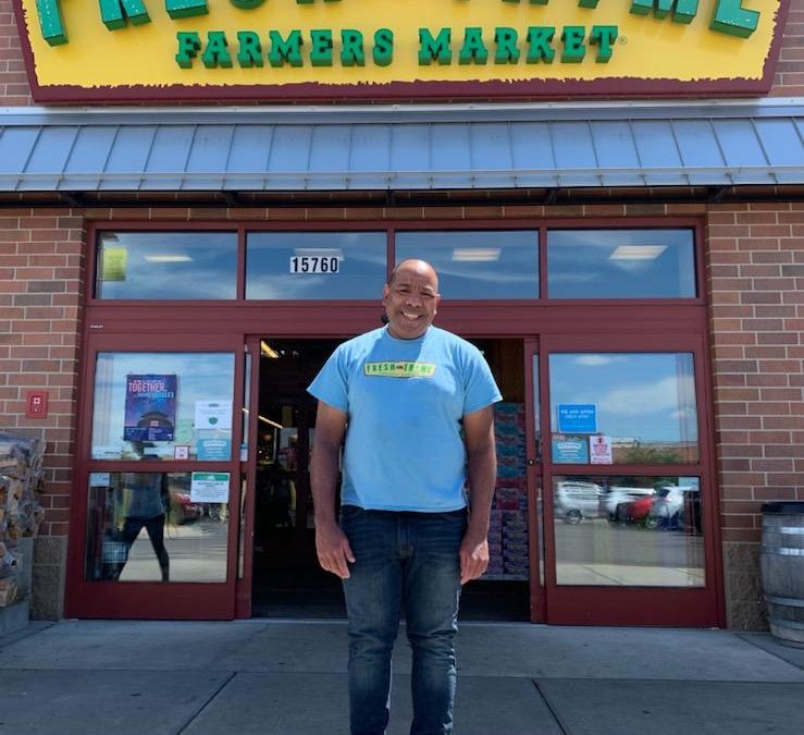 Andrew in a blue shirt standing in front of Fresh Thyme Store.