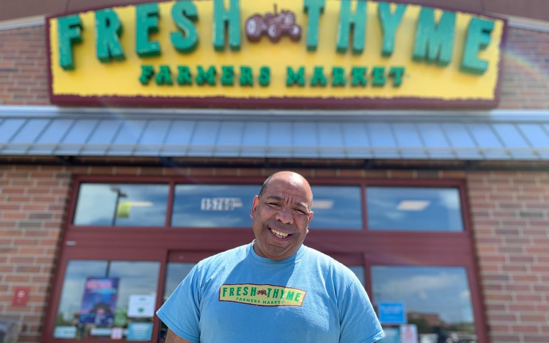 Andrew in a blue shirt standing in front of Fresh Thyme Store.